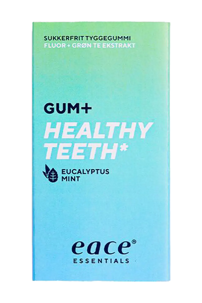 Gum + Healthy Teeth er utviklet for tennene dine. Disse tyggegummiene inneholder fluor, som bidrar til normal mineralisering av tenner. Dette har Eace kombinert med grønn te i tyggegummien, som har en god og frisk smak av eukalyptusmint.