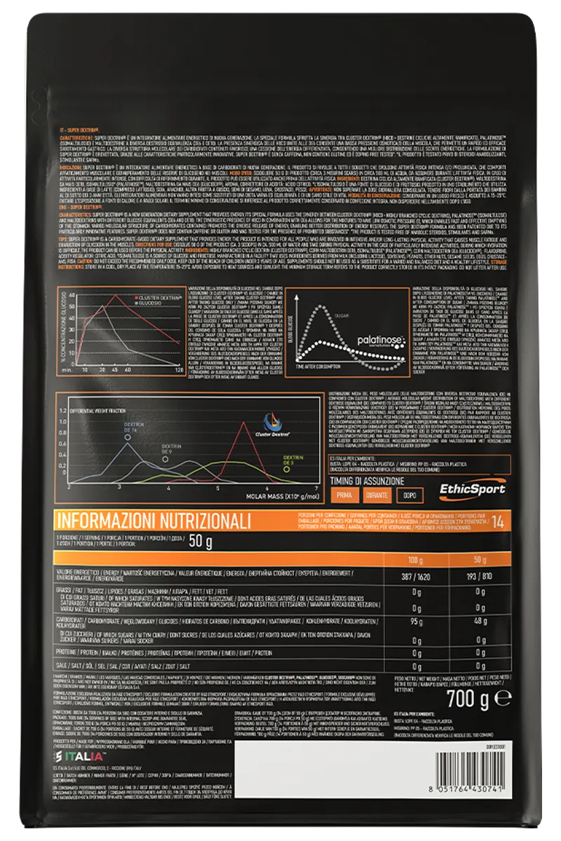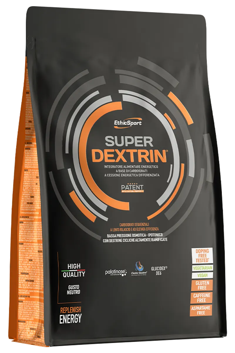 SUPER DEXTRIN® er et energitilskudd av ny generasjon. Den spesielle formelen utnytter synergien mellom Cluster Dextrin® (sterkt forgrenede sykliske dekstriner), Palatinose™ (isomaltulose) og maltodekstriner med forskjellige dekstroseekvivalenter (DE6 og DE18).