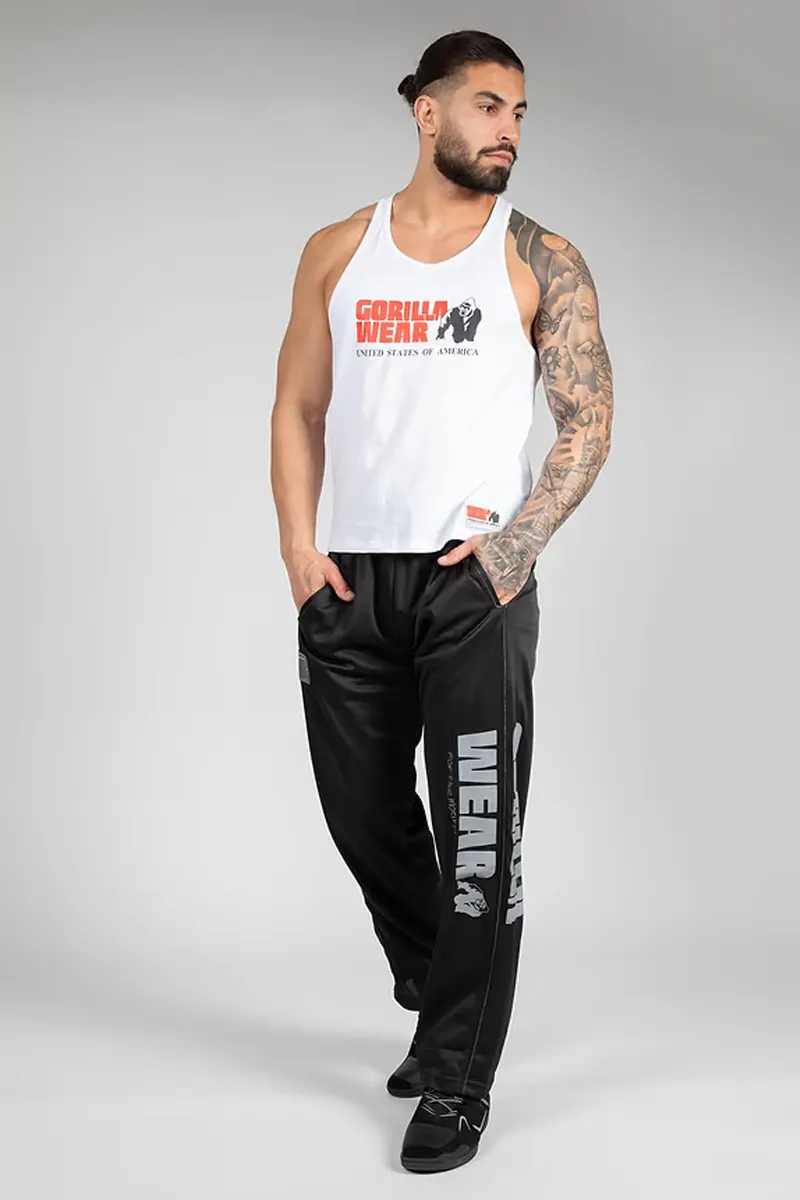Stilige mesh bukser av slitesterk polyester med god pusteevne. Buksene er utstyrt med sidelommer, strikk og snor i livet for best mulig passform. Flott klassisk Gorilla Wear logo på det ene beinet og mange andre fine detaljer. Passer like bra til trening som hverdags og er perfekt å kombinere med andre Gorilla Wear klær.