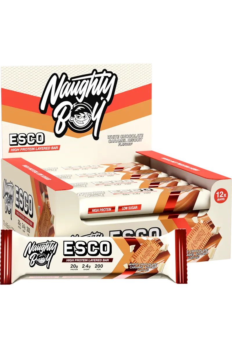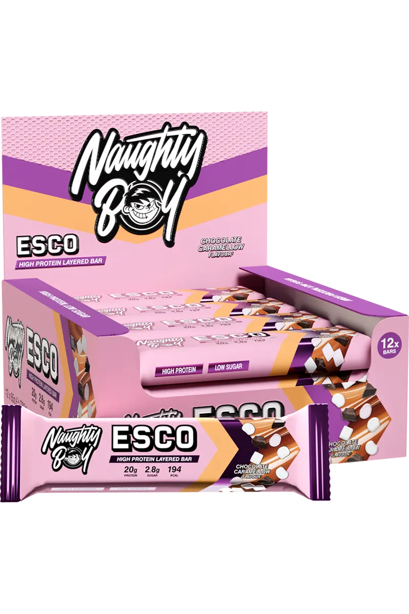 Naughty Boy ESCO Bar er ikke en vanlig proteinbar. Med en blanding av sprø og kremete teksturer og 20 gram protein per bar, er den laget for å holde musklene i sjakk samtidig som den behandler smaksløkene dine. Protein bidrar til muskelvekst, støtter muskelstyrke og bidrar til å opprettholde muskelmasse. Denne dristige snacksen har lavt sukker- og karbohydratinnhold og er perfekt når du vil ha noe som treffer blink uten skyldfølelse. Smash den etter trening eller ta en når du er på farten.
