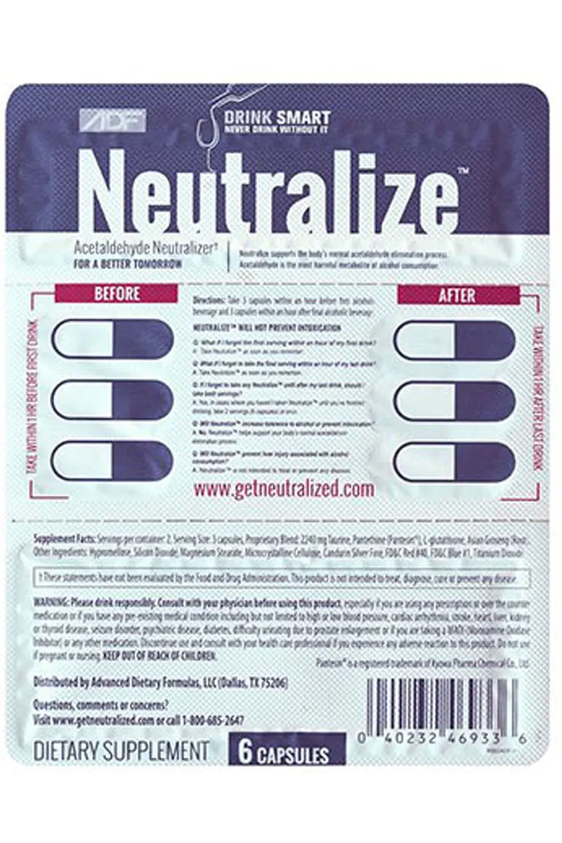 Hvordan virker den? Neutralize reduserer mengden av acetaldehyde, som er et giftstoff som dannes i kroppen under inntak av alkohol. Acetaldehyde er stoffet som skaper følelsen av bakrus/hangover og er også generelt skadelig for kroppen.