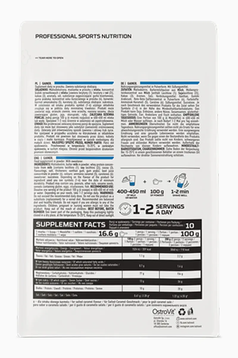 OstroVit GAINER er en serie med karbohydrat- og proteintilskudd, dedikert spesielt til alle fysisk aktive mennesker. Produktet har et høyt innhold av karbohydrater (77 %), som er den primære energikilden i kostholdet vårt. Hvis du regelmessig driver med sport og ønsker en enkel måte å øke kroppsvekten på – prøv OstroVit GAINER – næringsstoffer tilgjengelig i opptil 7 deilige smaker!