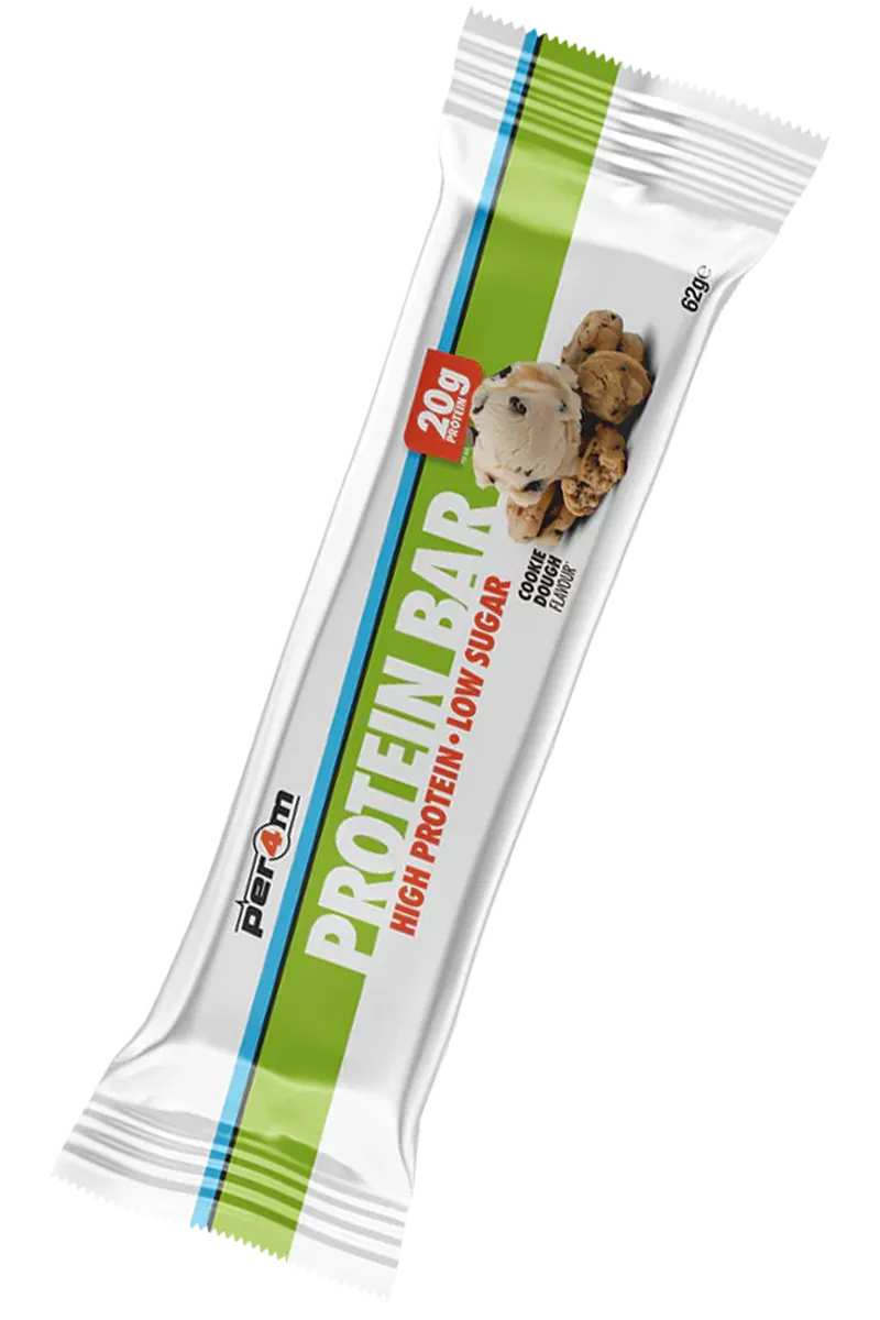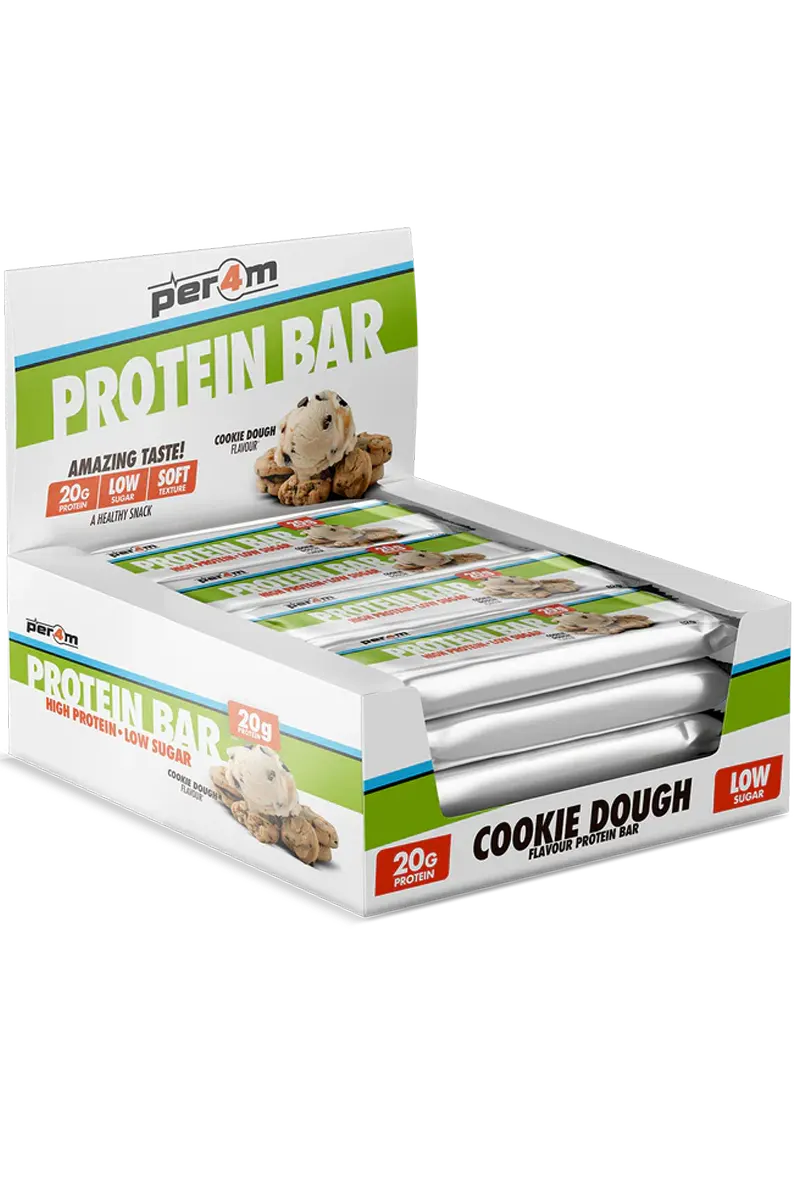 Per4m Cookie Dough Protein Bar – en luksuriøs blanding av rike, klissete teksturer og deilige smaker. Inni finner du en myk kjeksdeigkjerne, fullpakket med biter av dekadente kjeksbiter og et glatt lag med karamell med lavt sukkerinnhold, pakket inn i et silkemykt melkesjokoladetrekk. En smak så uimotståelig at det er vanskelig å tro at det er en proteinbar. Perfekt for livet på farten. Nyt den som en rask oppkvikker mellom møter, som en restitusjonssnack etter trening, eller som en kveldsgodbit når suget melder seg. Med Per4m Cookie Dough Protein Bar får du det beste fra begge verdener: en deilig snacks og et proteinrikt kraftverk. Gi dagen din energi og skjem bort smaksløkene dine med en bar du vil elske fra første bit.